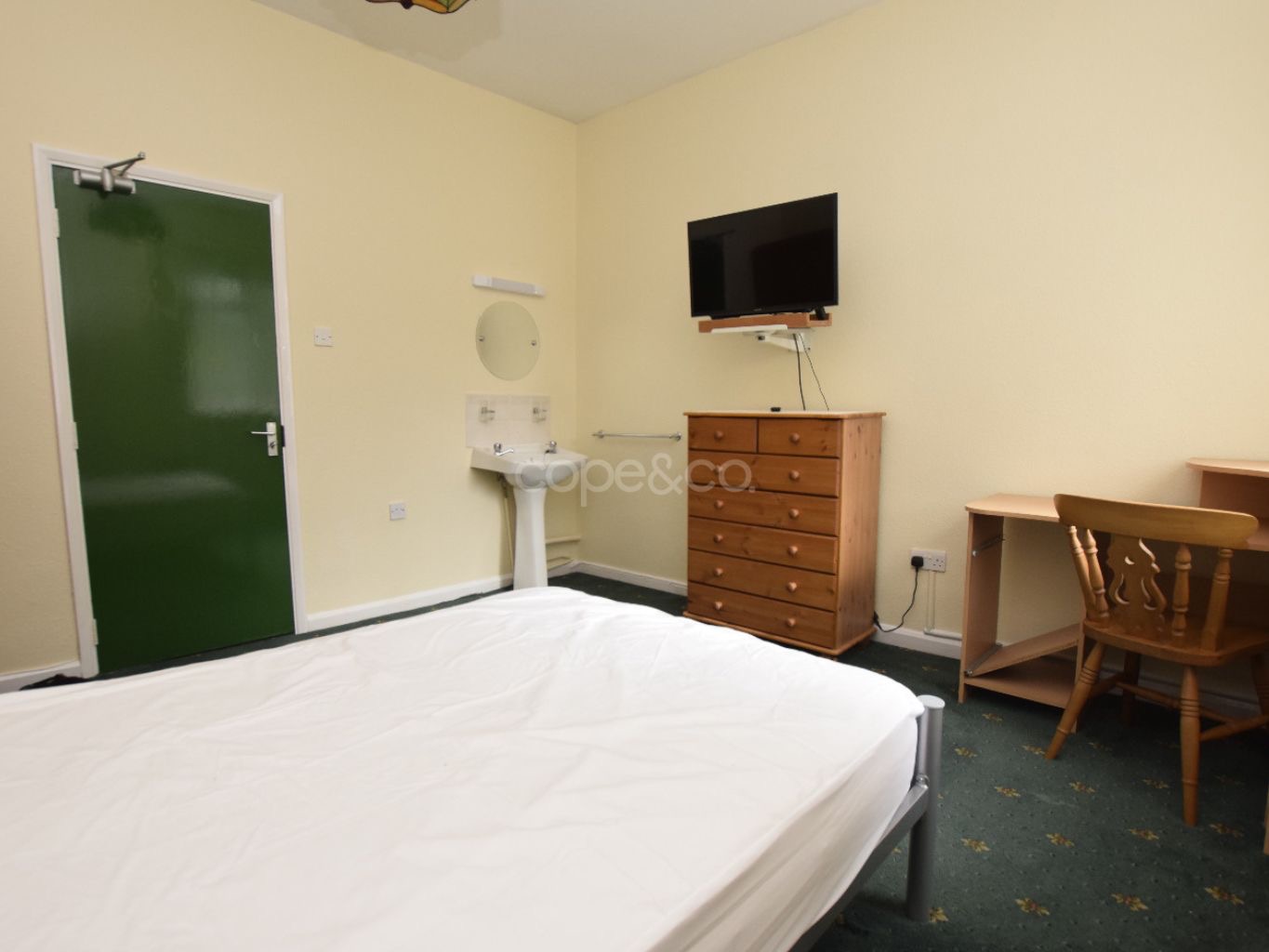 Wall mounted Tv and wash basin in room